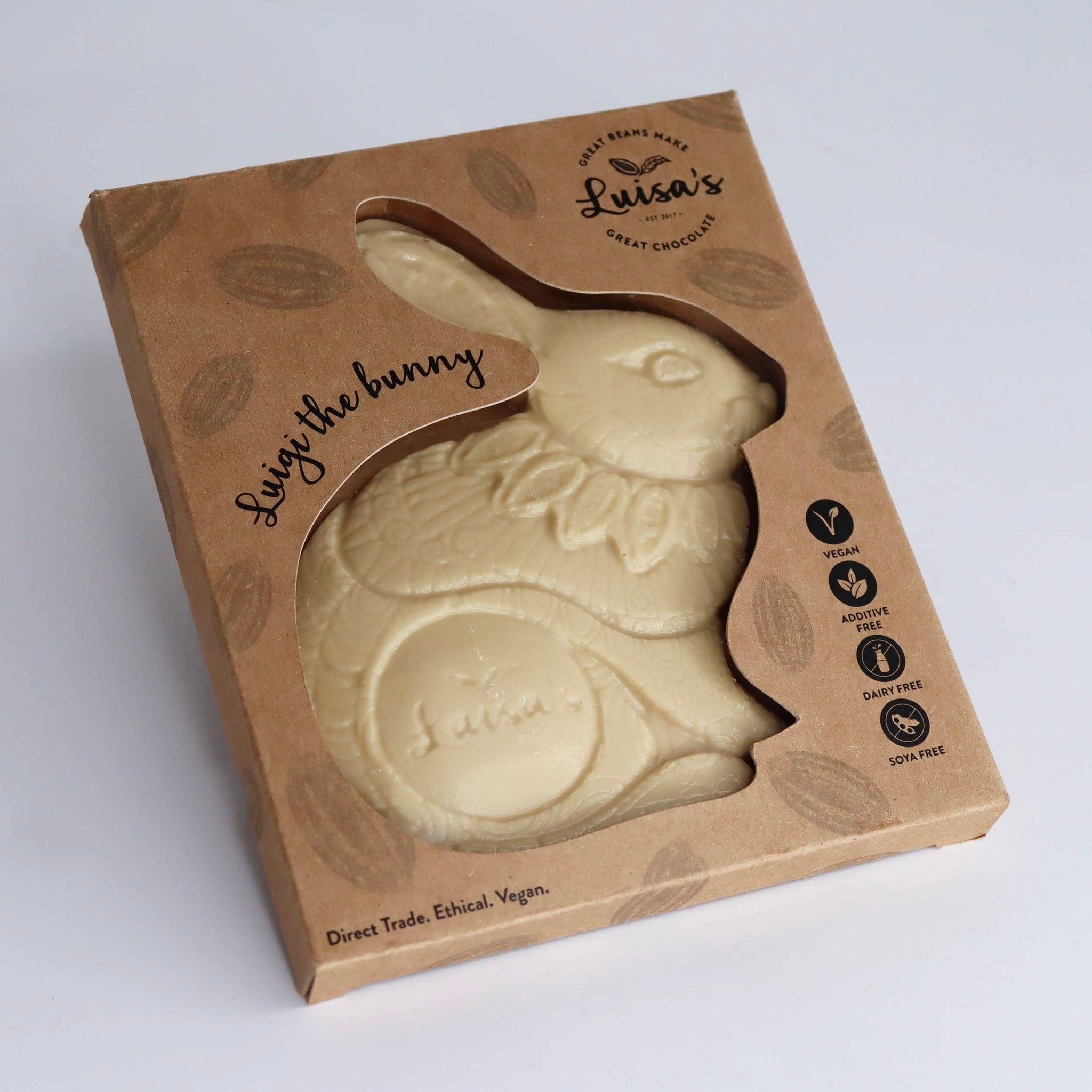 Our handcrafted artisan Luigi Bunny features a beautifully intricate design and is made with craftsmanship, quality, and ethics at its heart. This generous slab of luxurious chocolate makes a truly special Easter gift. Now in biodegradable packaging made from sea kelp.