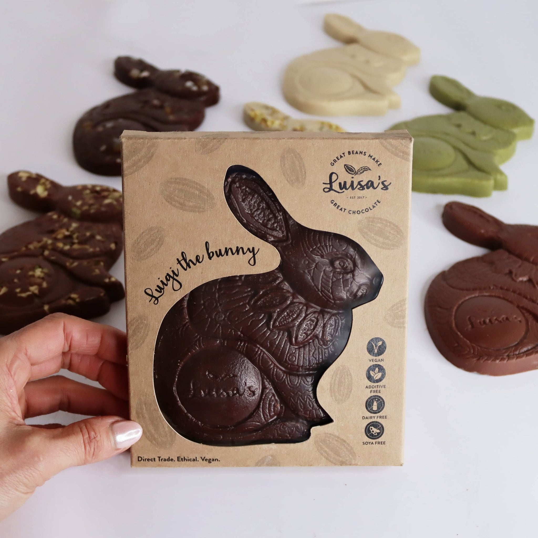Each Luigi Bunny is handcrafted with a beautifully intricate design and made with craftsmanship, quality, and ethics at its heart. This generous slab of luxurious chocolate makes a thoughtful Easter gift - elegant, delicious, and full of character. Now in biodegradable packaging made from sea kelp.